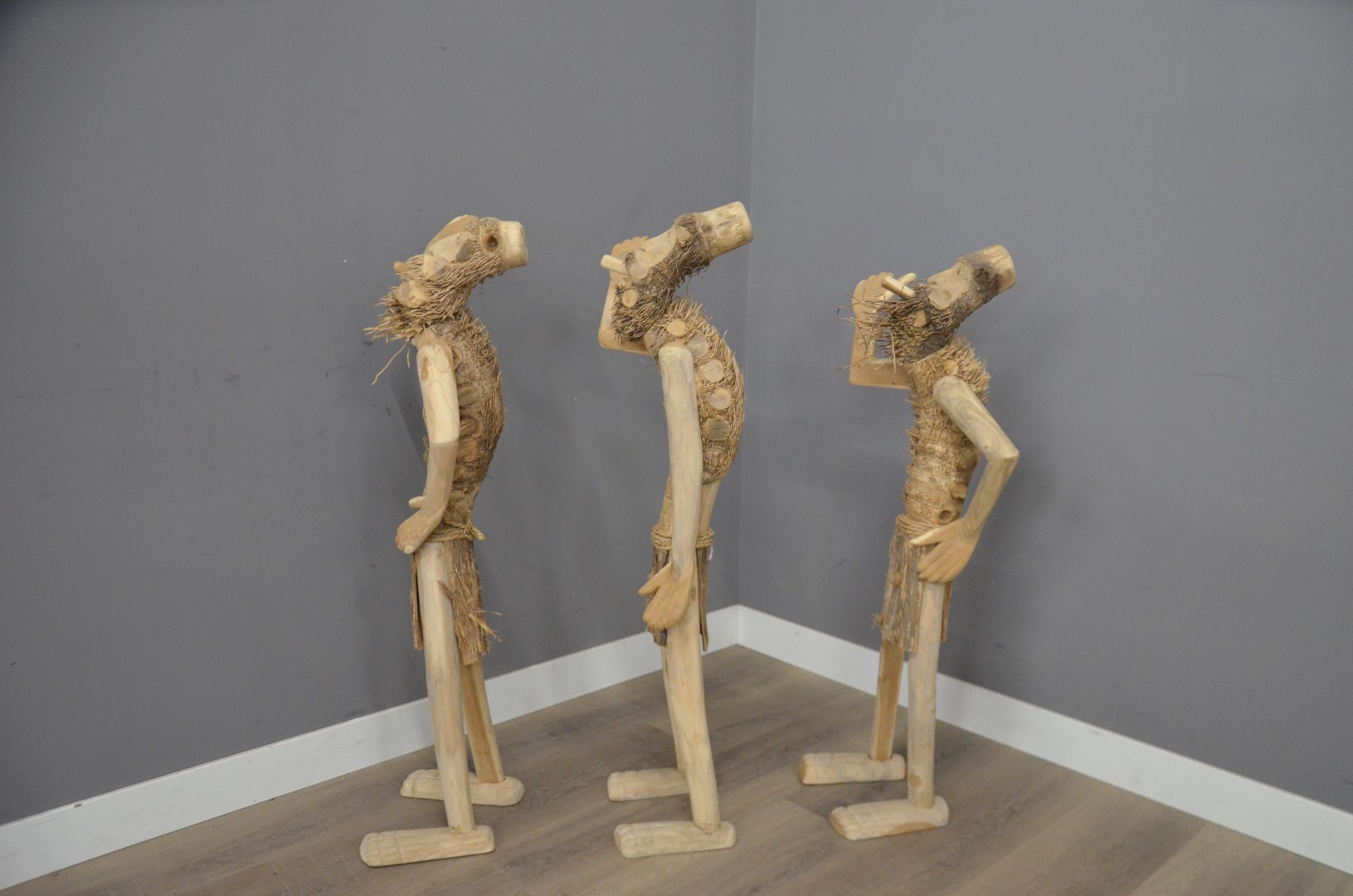 Met een hoogte van 125 cm zijn deze beelden een opvallende blikvanger. De natuurlijke houtstructuur geeft elk figuur een eigen persoonlijkheid.