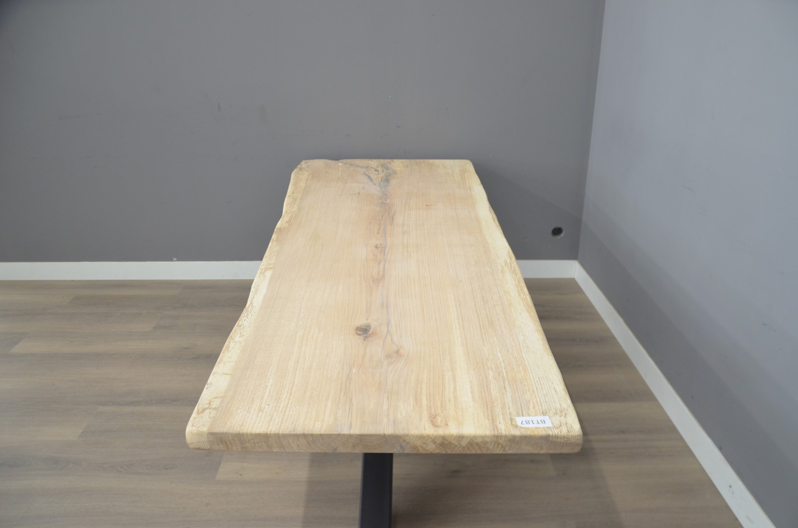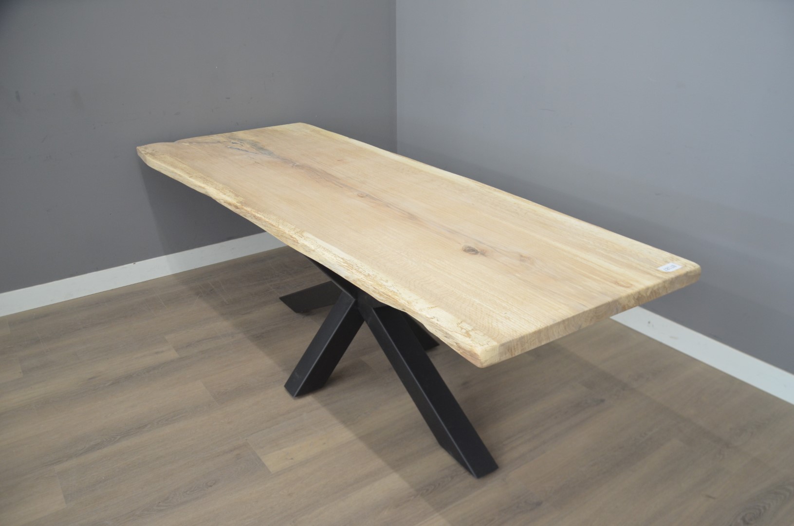 Deze industriële eiken boomstamtafel is een eetkamertafel gemaakt van eiken hout. De lichte kleur van het hout geeft een moderne uitstraling. Het blad bestaat uit ~5 cm dik massief eiken hout.