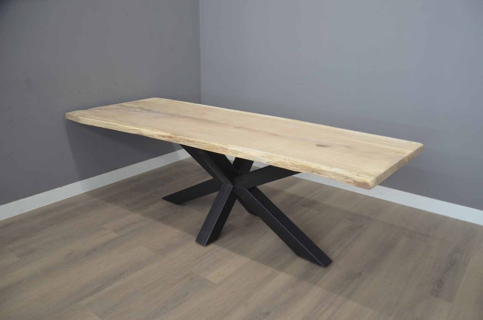 Er is steeds meer keuze uit verschillende tafelpoten. Ga je voor een industriële look dan hebben we een grote diversiteit aan industriële tafelpoten van metaal in onze showroom staan. Je kan zelf kiezen wat bij jou past. Er is keuze uit onder andere een U-poot, X- Poot of trapezium poot. Samen met het prachtige boomstamblad naar keuze heb je een stoere industriële boomstam tafel thuis staan. Een spinpoot zoals op de foto heeft een meerprijs van 175,-