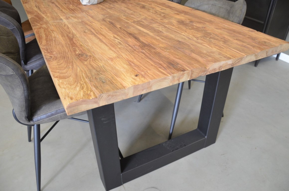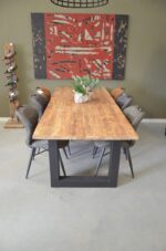 Deze robuuste eetkamertafel is gemaakt van oud gerecycled teak. Deze tafel heeft een blad van 4 cm. Onder het blad bevinden zich twee metalen U poten. We kunnen dit aanpassen voor u naar een ander onderstel.