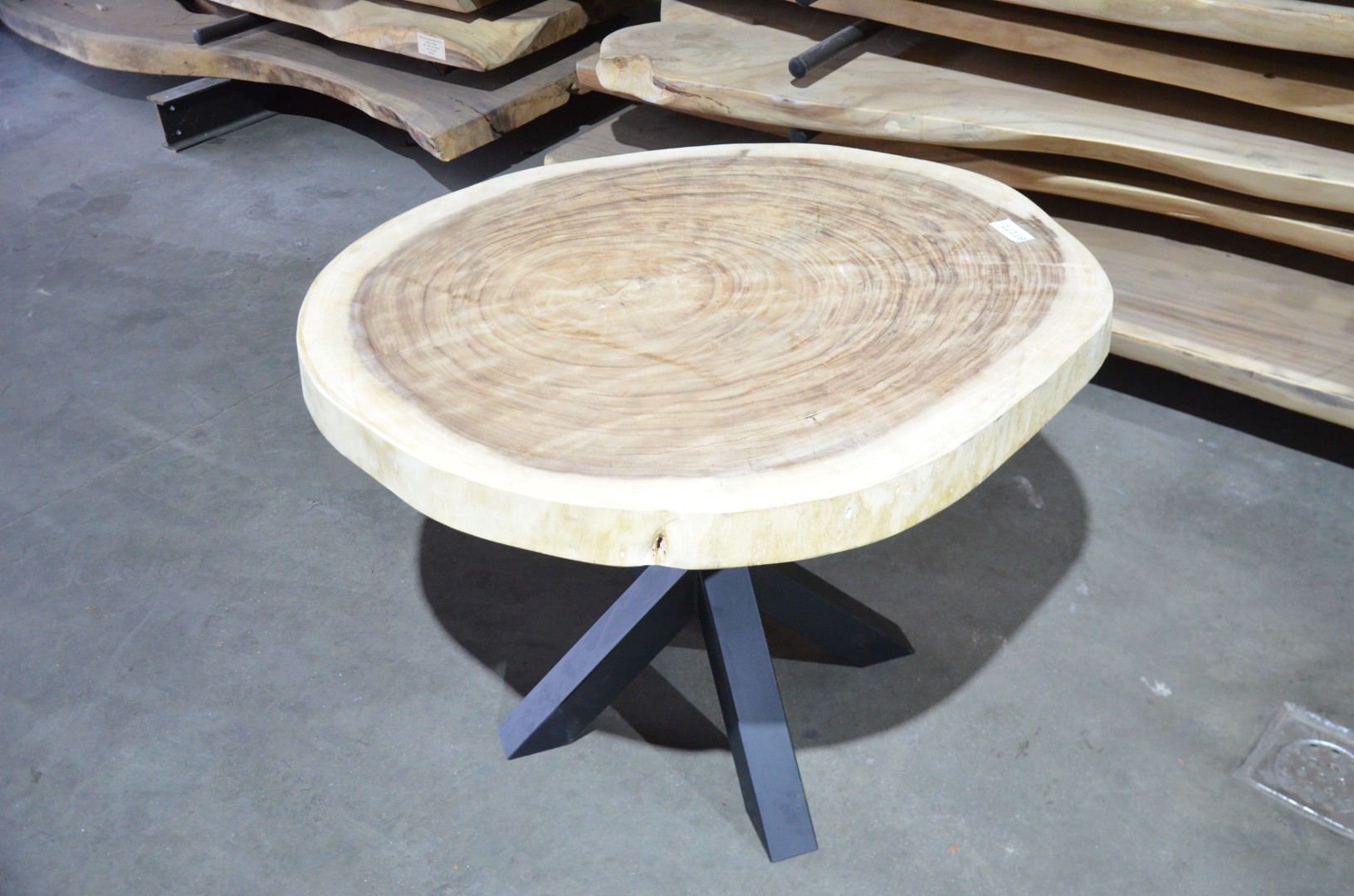 Deze boomstamtafel is gemaakt van de houtsoort Suar en is volledig massief. Deze Suar boomstamtafel heeft een blad met een doorsnede van 100 -120 cm! Het blad bestaat uit één deel.