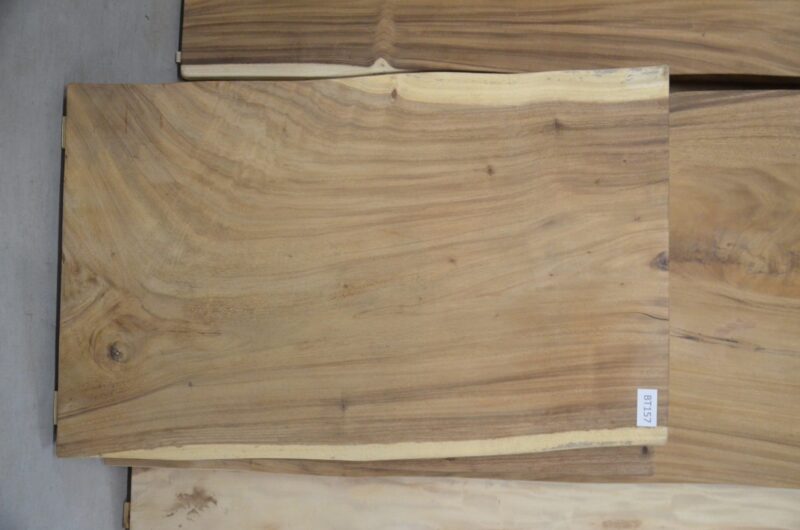 Een indrukwekkende eettafel van 120 cm lang, gemaakt van een massieve Suar boomstamblad. Het blad kenmerkt zich door zijn prachtige natuurlijke randen, levendige houtnerven en unieke kleurschakeringen, waardoor elk exemplaar een origineel en authentiek stuk is.